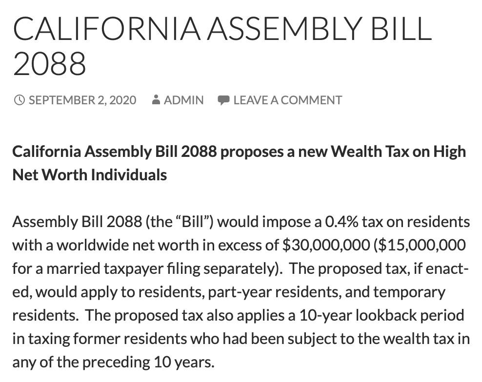 1. California is going to impose a 0.4% tax on residents with a worldwide net worth in excess of $30,000,000. The proposed tax applies to anyone spending as little as 60 days in California. Finally, it continues to apply for 10 years after you leave the state if you were a resident when the Bill passes (which it has not yet)