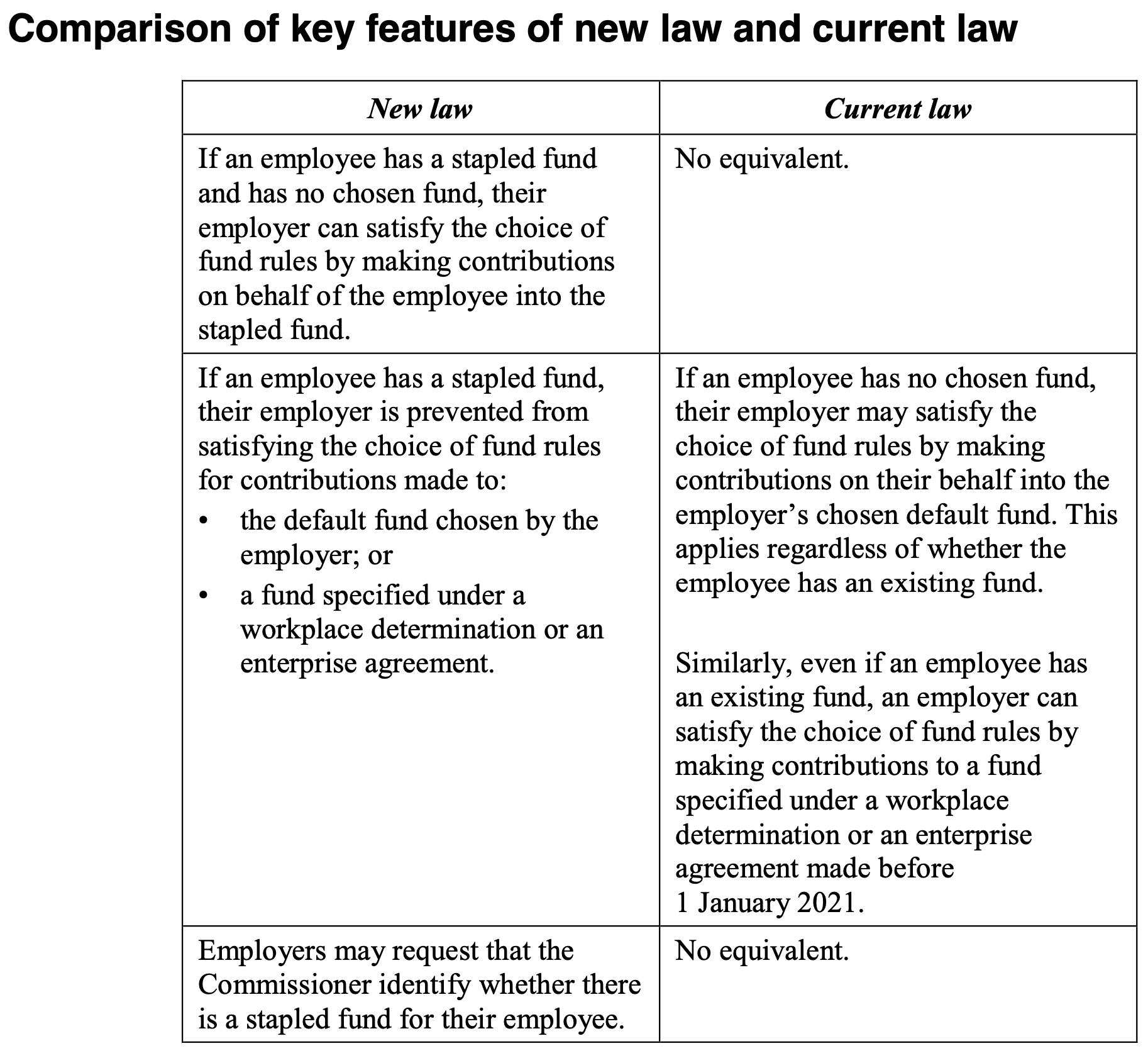 Under the changes, to comply with the choice of fund rules an employer must make super contributions to the “stapled fund” of an employee who: