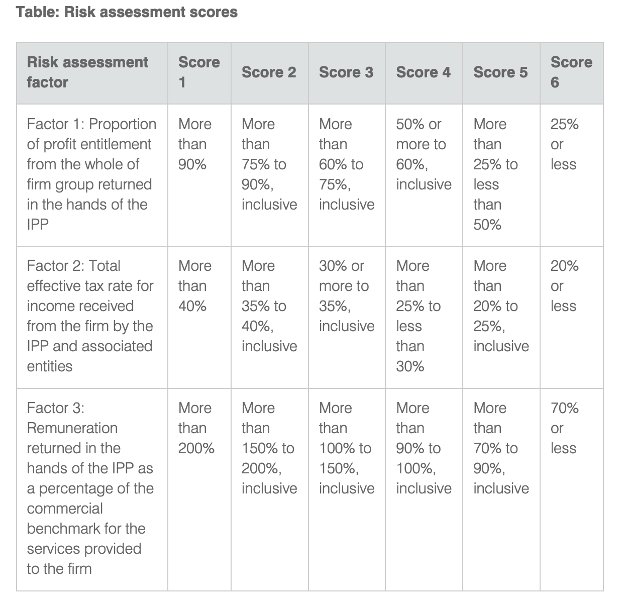 For example, if the partner in the engineering firm took 62% of the amounts coming from the firm (Factor 1 is score 3), the effective tax rate across all of the income coming out of the firms was 28% (Factor 2 is score 4) and there is no commercial benchmark (Factor 3 does not apply, the risk score is 7 (3 + 4) and this in the table below say we are at low risk.