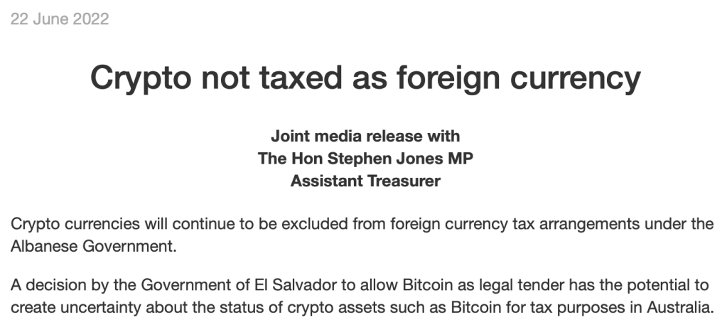 The Treasurer, in a media release, stated that crypto currencies will continue to be excluded from foreign currency tax arrangements under this Government and capital gains tax will continue to apply to crypto assets that are held as investments.