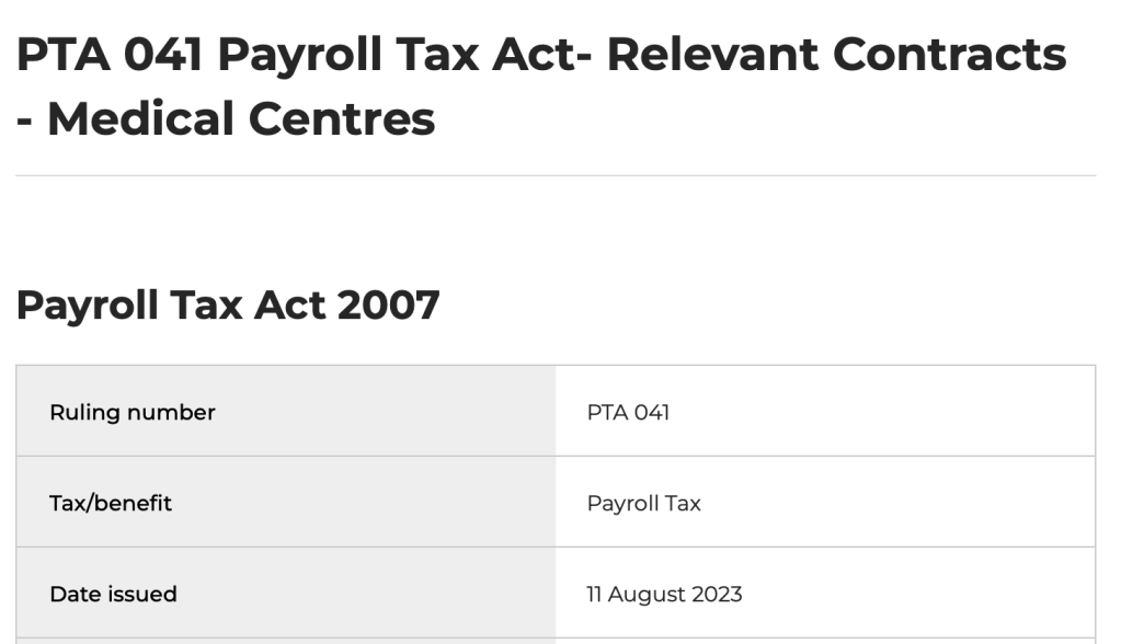 Four states (NSW, SA, QLD & VIC) have all released a Payroll Tax ruling on medical centres (the NSW one is at https://www.revenue.nsw.gov.au/help-centre/resources-library/rulings/payroll/pta-041 but they are all the same) and, as expected, the Rulings say in many cases payroll tax is payable on the standard medical centre arrangement… because if you read the contract the GPs working in the medical centre clearly fall within the Payroll Tax contractor provisions.